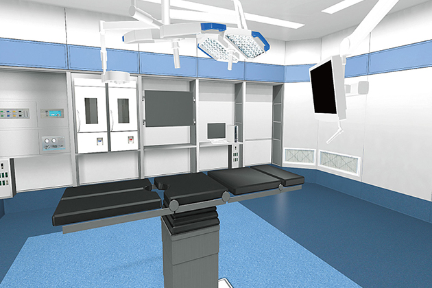 手術室は、標準化された壁面パネルとシステム天井、必要な設備機器のハードウェアから構成されています。